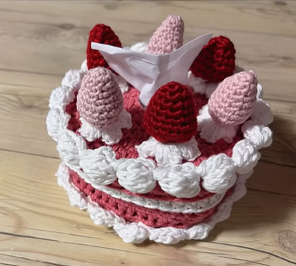 ティッシュケースを編んだそうですが、ただのティッシュケースではなくケーキ型のものなんですって。